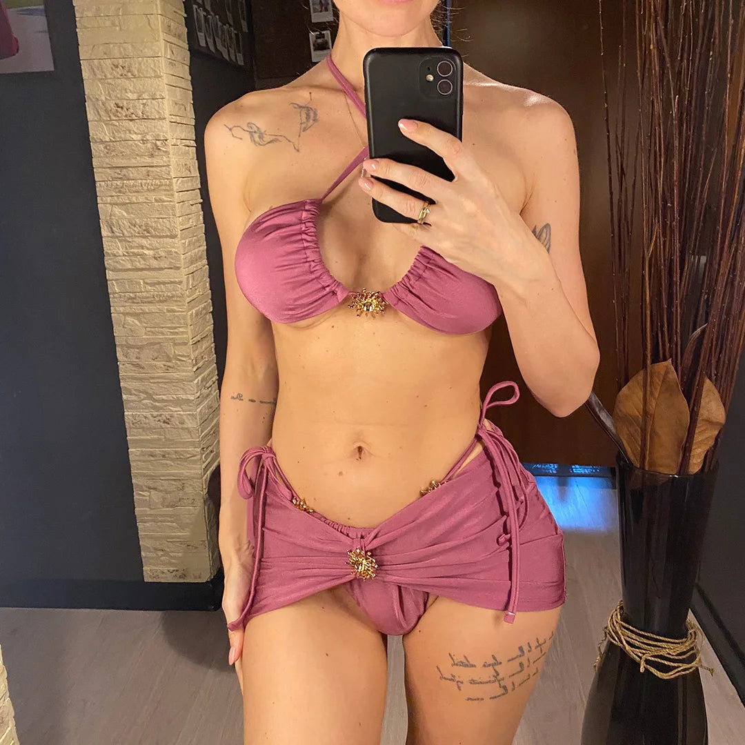 The Murta Pink Rush Skirted is the ultimate statement set for girls who don’t play it safe. Featuring a ruched halter top, cheeky Brazilian-cut bottom, and a matching mini skirt with side ties — this three-piece combo is the definition of beachside fire.